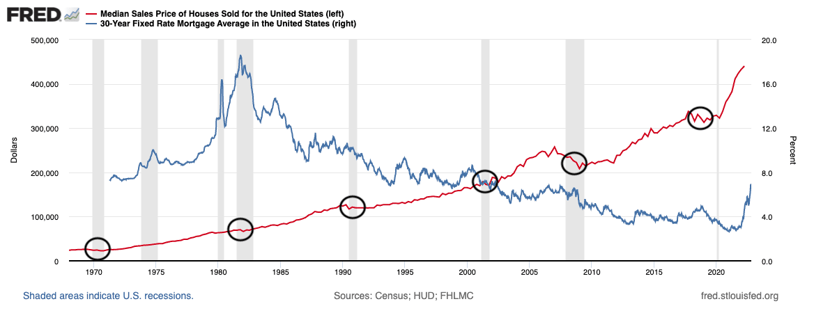 The only real comparison for the scale of rate hikes we have seen recently are the Fed’s actions in the late 1970’s and early 1980’s to quash inflation. Because of the Fed’s actions and other factors including inflation, mortgage rates rose from 8.65% in 1977 to 18.63% in 1981. Over those four years of incredibly high rates, the median sales price of a home in the United States rose from $46,300 to $70,400 - that’s just over 52% growth!