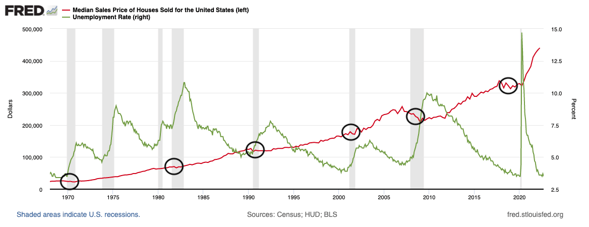 What other factors might impact the current housing market even more than mortgage rates? The chart below shows the same 6 highlighted markets as discussed above. Notice the strong correlation between unemployment and housing values. Since 1970 nearly every market that’s seen falling housing prices has also seen quickly rising unemployment.