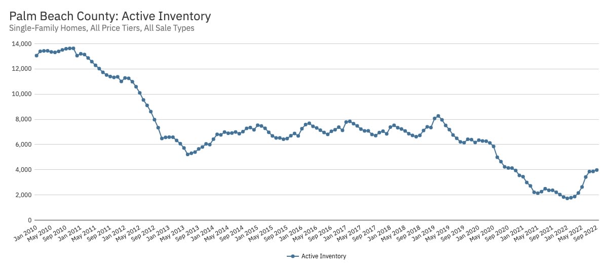 The current Palm Beach County market shows the impact of these “golden handcuffs” on inventory. While inventory has come up from the historic lows of last year, the growth of inventory has plateaued, as evident on the chart below. In the 8 years prior to the pandemic it was typical to have around 7,000 active listings of single family homes in Palm Beach County. Over the last few months it appears the market is settling in at around 4,000 active listings.