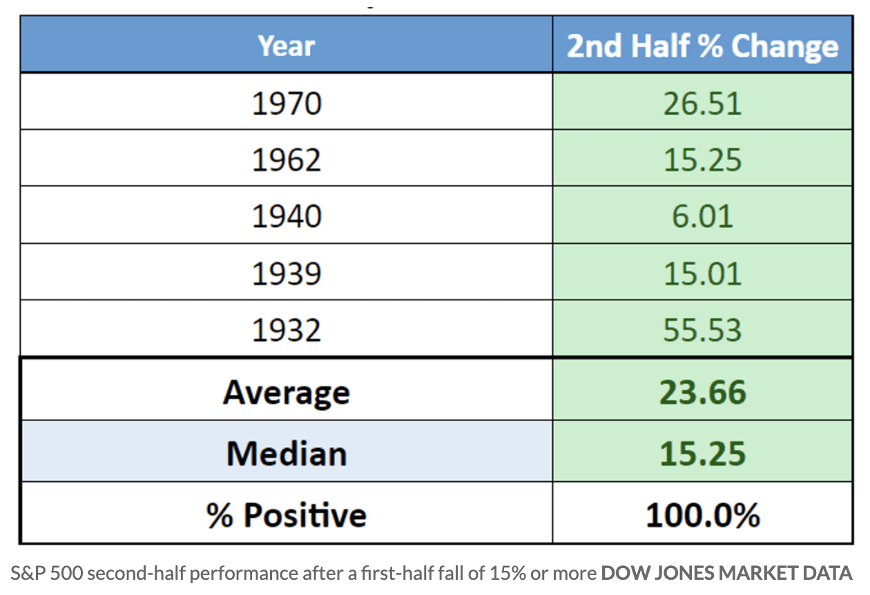 • It’s been well reported that the stock market is off to a brutal start in 2022. This is the sixth instance where the S&P 500 is down more than 15% halfway through the year. But, a rough first half doesn’t necessarily mean that trend will continue through the rest of the year. In each of the five prior first half declines, the S&P rose in the second half, with a median growth of over 15%. (MarketWatch)