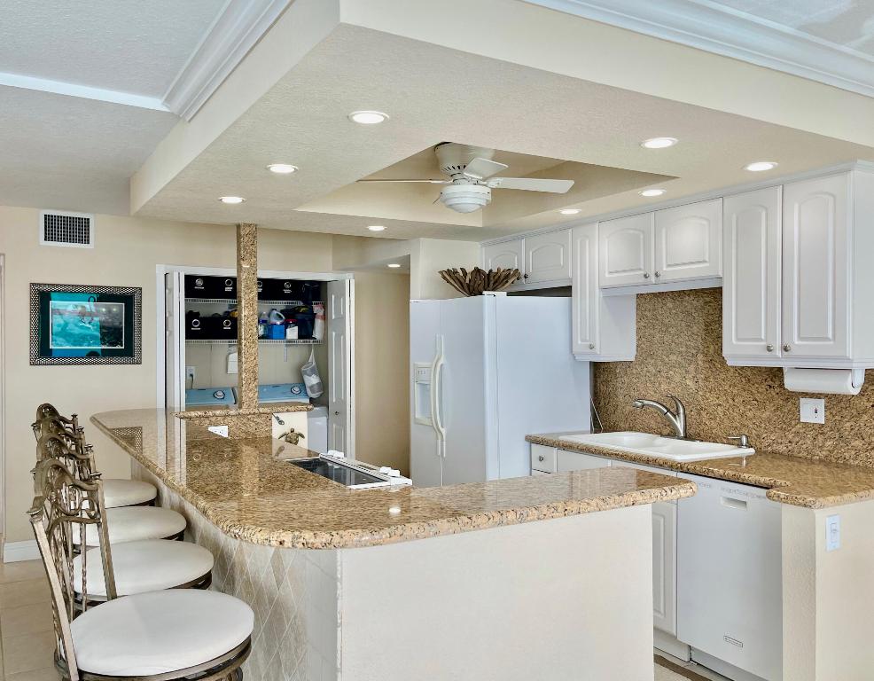 Beautiful Sunny SE Direct Ocean Corner. Wrap-around tempered glass balconies w/hurricane rated impact glass sliding doors/windows. Outstanding ocean views. Open Kitchen w/granite counters showcasing expansive ocean views. Sea Wall in place. Interior full size Maytag washer/dryer. Pet friendly for one 15 lb pet. Covered parking #104. Enjoy rental income year 1. Four rentals per year - 90 day minimum! Offered furnished/turnkey. Great location on the island's pristine north end far from crowded beaches and close to shopping, dining & local culture. Bask in the sun on the elevated pool deck overlooking ocean with circular heated pool and private beach access. In 2023, building concrete restoration completed. Enjoy billiards, fitness gym, library, sauna & community lounge w/events.