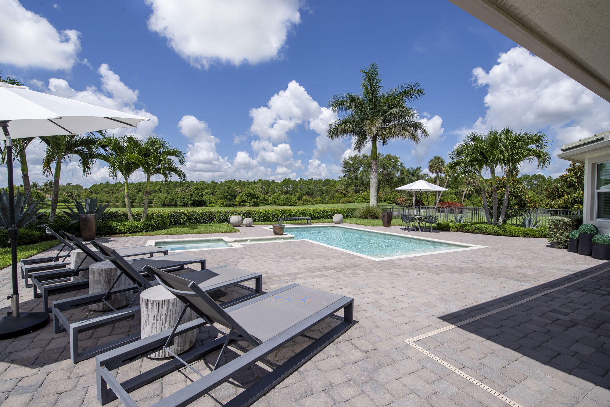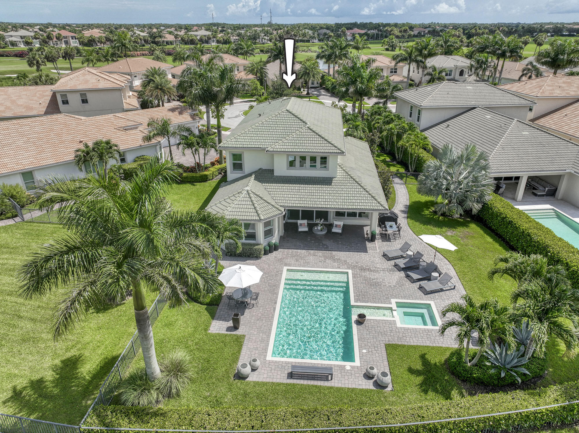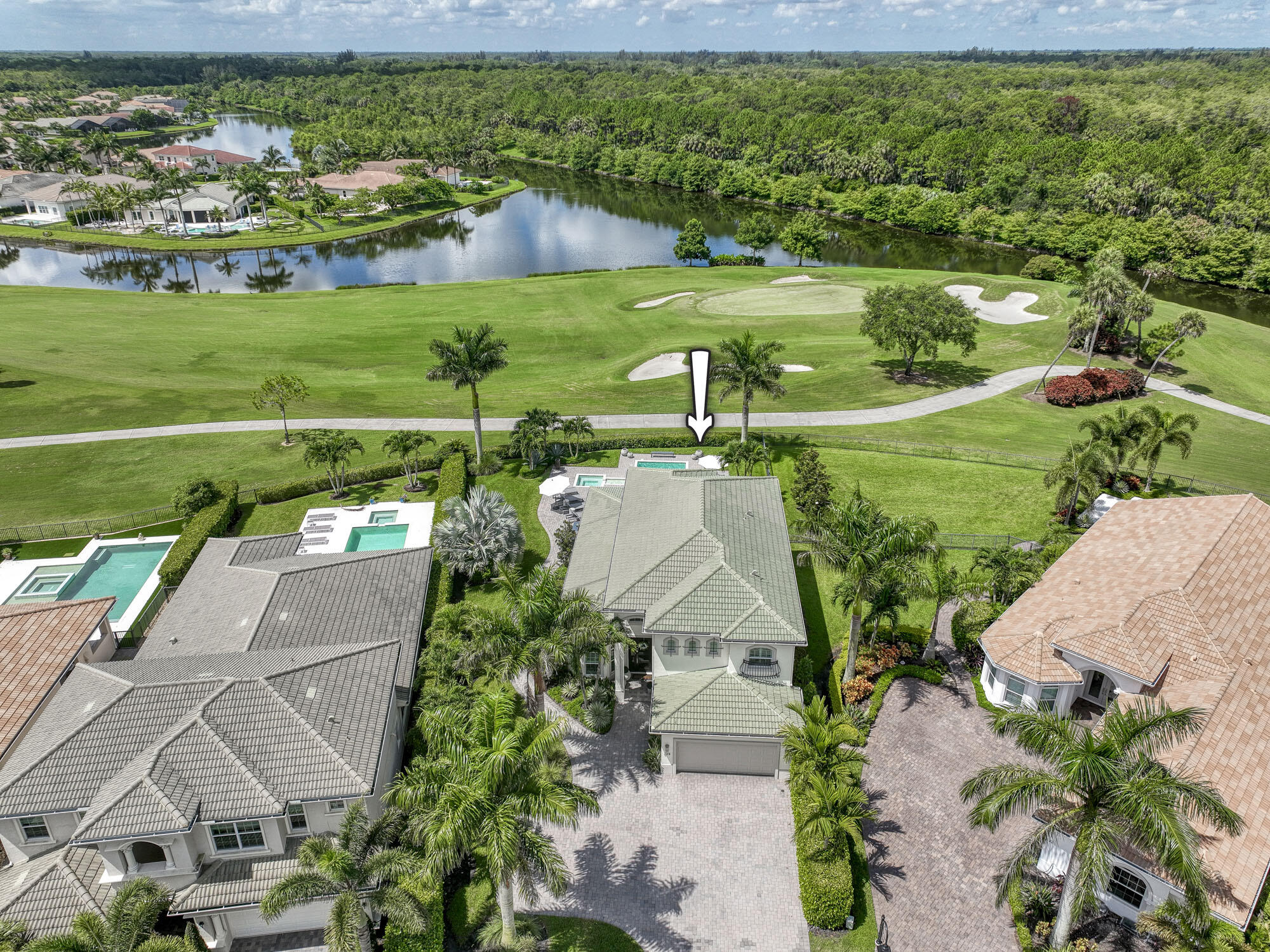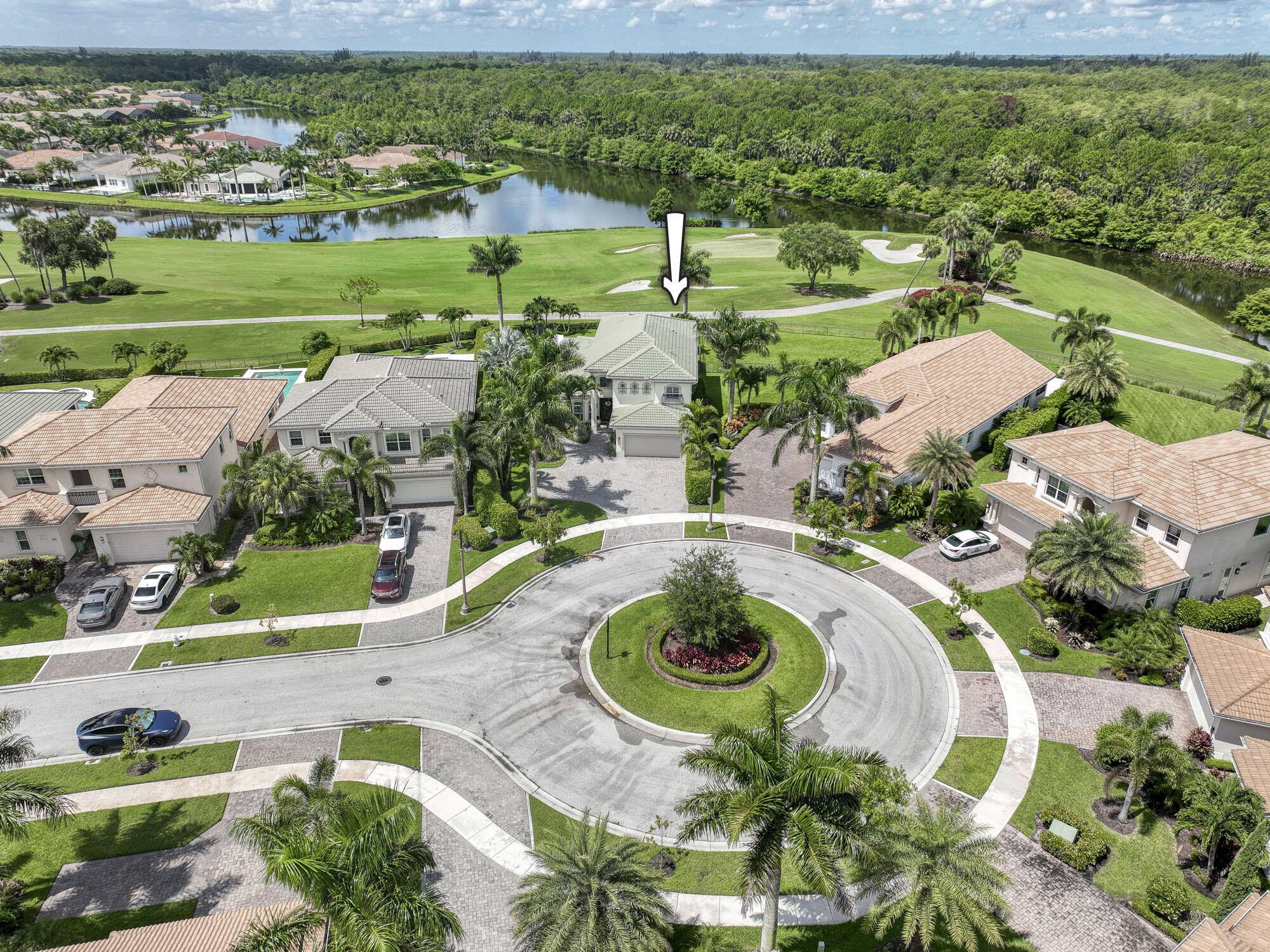 This exquisitely designed 2019-built home offers breathtaking lake, golf & preserve views from one of the best homesites in the resort style gated community of Jupiter Country Club. This rare Saviero model is one-of-a-kind and has 4 bedrooms, 4 baths plus a flex room/den. The prime cul-de-sac location within the community provides sweeping tree-lined views of Riverbend Park, the winding lake & the 11th green. Live comfortably in this energy efficient home with CBS construction, natural gas, reverse osmosis water filtration system in kitchen, and impact glass windows & doors throughout. The newly replaced custom impact glass front door and voluminous two story ceilings welcome you into the open concept great room with immediate backyard views through the wall to wall windows. Professionally designed & customized from top to bottom, this home exudes modern sophistication and provides all the essentials of easy Florida living. You will see the high quality finishes and attention to detail flow throughout the home. Stunning light fixtures are throughout the home. No standard finishes here! Rest peacefully in the primary retreat where the original floor plan was modified to encompass a downstairs guest room and transformed into the primary spa-like bath & expansive modern custom closet. Friends & family will gather at the kitchen's expansive center island featuring a waterfall quartz countertop & pendant lighting. Kitchen upgrades include gorgeous white solid wood cabinetry with glass panels, pull out shelving, tile backsplash, built-in refrigerator, 5 burner gas cooktop & double ovens. The flex room/office and a full bath are located downstairs. 3 guest bedrooms are upstairs-all bedrooms have walk-in closets with built-ins & 2 have ensuite baths. Step out through the great room's sliding glass doors into the outdoor oasis. Surrounded by mature palm trees and tropical landscaping, this area boasts a covered lanai, motorized retractable screens, a lovely pool & spa with a sunshelf and the most serene preserve, lake and golf course vistas. Sunsets are enchanting from this relaxing outdoor living space perfect for lounging & entertaining! This home can be purchased turnkey furnished including a golf cart. Jupiter Country Club is a luxury gated community conveniently located within close proximity of I-95 and the FL Turnpike, beaches, shopping, restaurants, parks & nature preserves. Club amenities & events offer a plethora of social opportunities and include a Greg Norman Signature golf course, 2 resort-style pools, the Sway restaurant & bar, a state-of-the-art fitness center + yoga/mat pilates/barre group fitness classes, massage/facial treatment services, tennis, bocce ball, pickle ball & basketball. Members enjoy reciprocal privileges to Invited Clubs worldwide. Live your best life here!