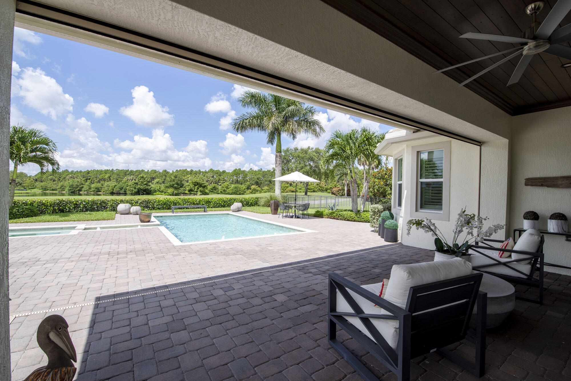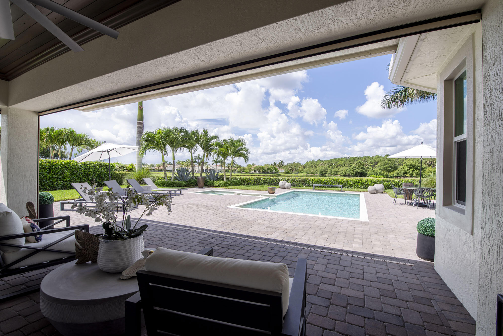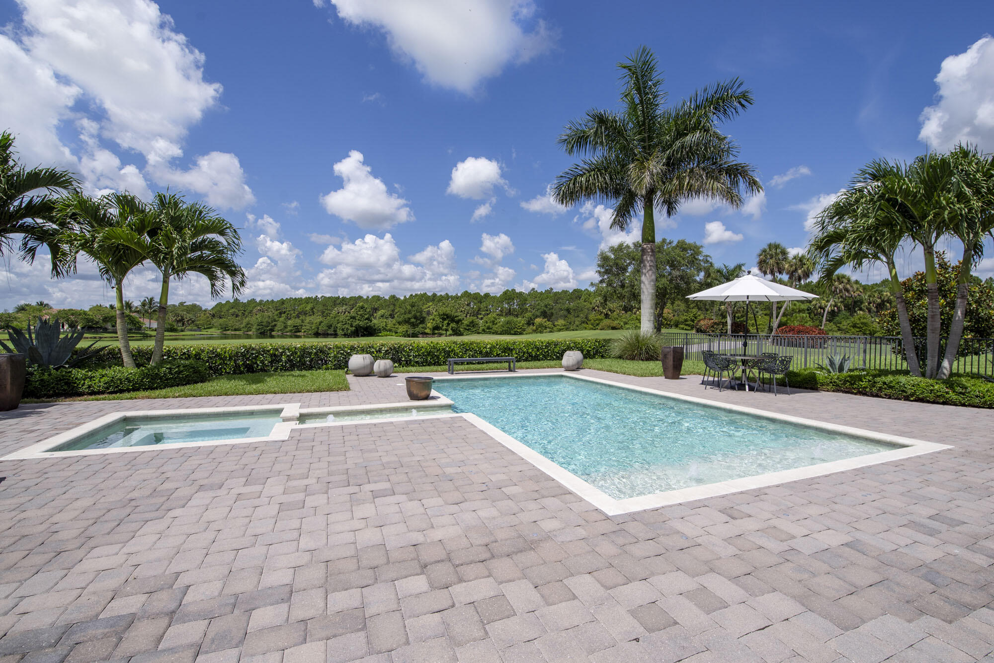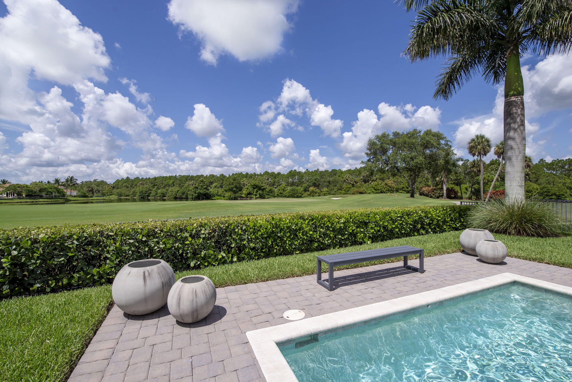This exquisitely designed 2019-built home offers breathtaking lake, golf & preserve views from one of the best homesites in the resort style gated community of Jupiter Country Club. This rare Saviero model is one-of-a-kind and has 4 bedrooms, 4 baths plus a flex room/den. The prime cul-de-sac location within the community provides sweeping tree-lined views of Riverbend Park, the winding lake & the 11th green. Live comfortably in this energy efficient home with CBS construction, natural gas, reverse osmosis water filtration system in kitchen, and impact glass windows & doors throughout. The newly replaced custom impact glass front door and voluminous two story ceilings welcome you into the open concept great room with immediate backyard views through the wall to wall windows. Professionally designed & customized from top to bottom, this home exudes modern sophistication and provides all the essentials of easy Florida living. You will see the high quality finishes and attention to detail flow throughout the home. Stunning light fixtures are throughout the home. No standard finishes here! Rest peacefully in the primary retreat where the original floor plan was modified to encompass a downstairs guest room and transformed into the primary spa-like bath & expansive modern custom closet. Friends & family will gather at the kitchen's expansive center island featuring a waterfall quartz countertop & pendant lighting. Kitchen upgrades include gorgeous white solid wood cabinetry with glass panels, pull out shelving, tile backsplash, built-in refrigerator, 5 burner gas cooktop & double ovens. The flex room/office and a full bath are located downstairs. 3 guest bedrooms are upstairs-all bedrooms have walk-in closets with built-ins & 2 have ensuite baths. Step out through the great room's sliding glass doors into the outdoor oasis. Surrounded by mature palm trees and tropical landscaping, this area boasts a covered lanai, motorized retractable screens, a lovely pool & spa with a sunshelf and the most serene preserve, lake and golf course vistas. Sunsets are enchanting from this relaxing outdoor living space perfect for lounging & entertaining! This home can be purchased turnkey furnished including a golf cart. Jupiter Country Club is a luxury gated community conveniently located within close proximity of I-95 and the FL Turnpike, beaches, shopping, restaurants, parks & nature preserves. Club amenities & events offer a plethora of social opportunities and include a Greg Norman Signature golf course, 2 resort-style pools, the Sway restaurant & bar, a state-of-the-art fitness center + yoga/mat pilates/barre group fitness classes, massage/facial treatment services, tennis, bocce ball, pickle ball & basketball. Members enjoy reciprocal privileges to Invited Clubs worldwide. Live your best life here!