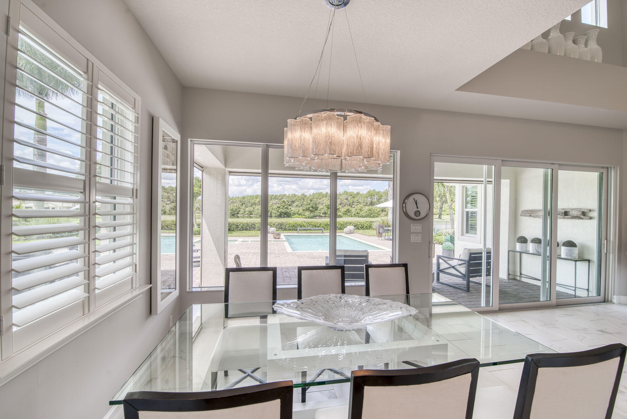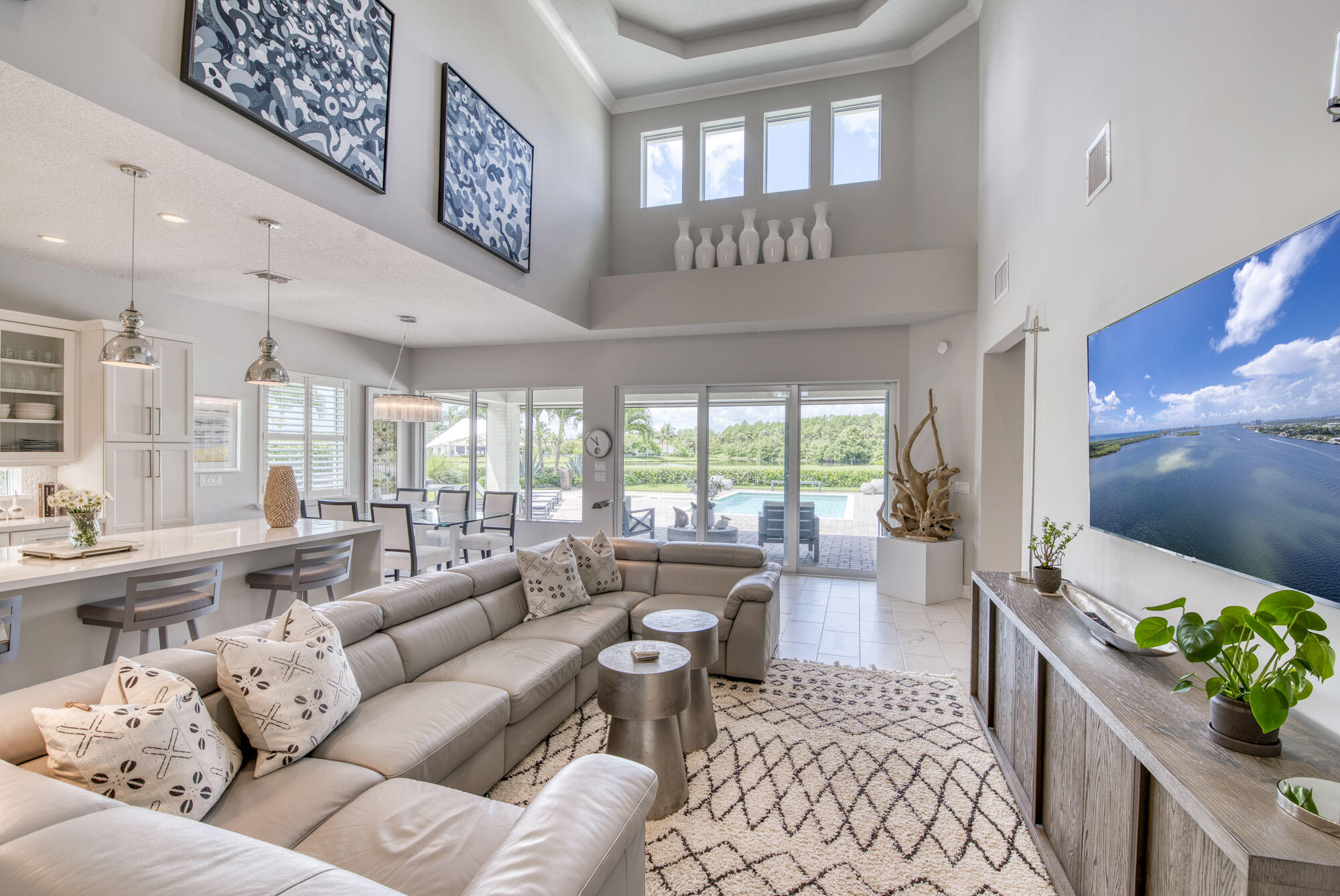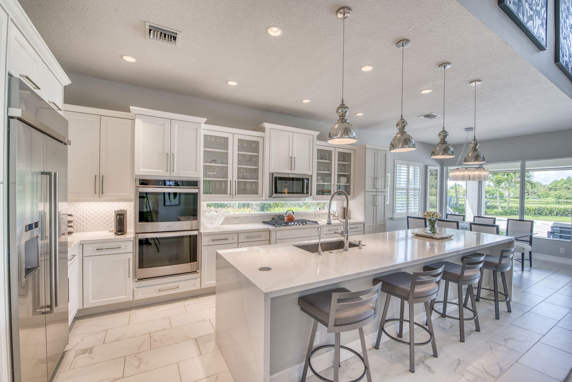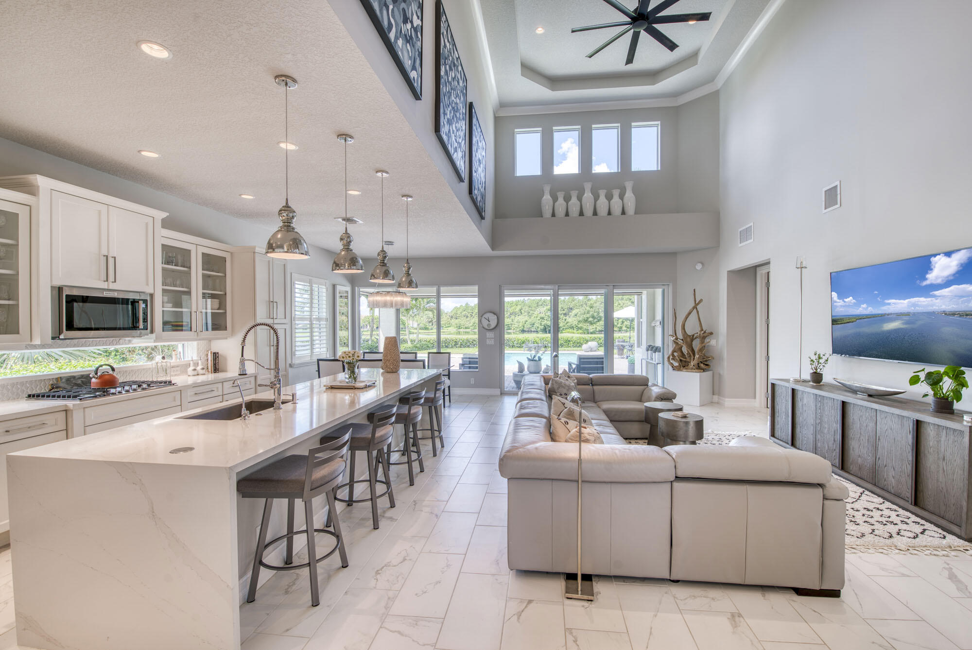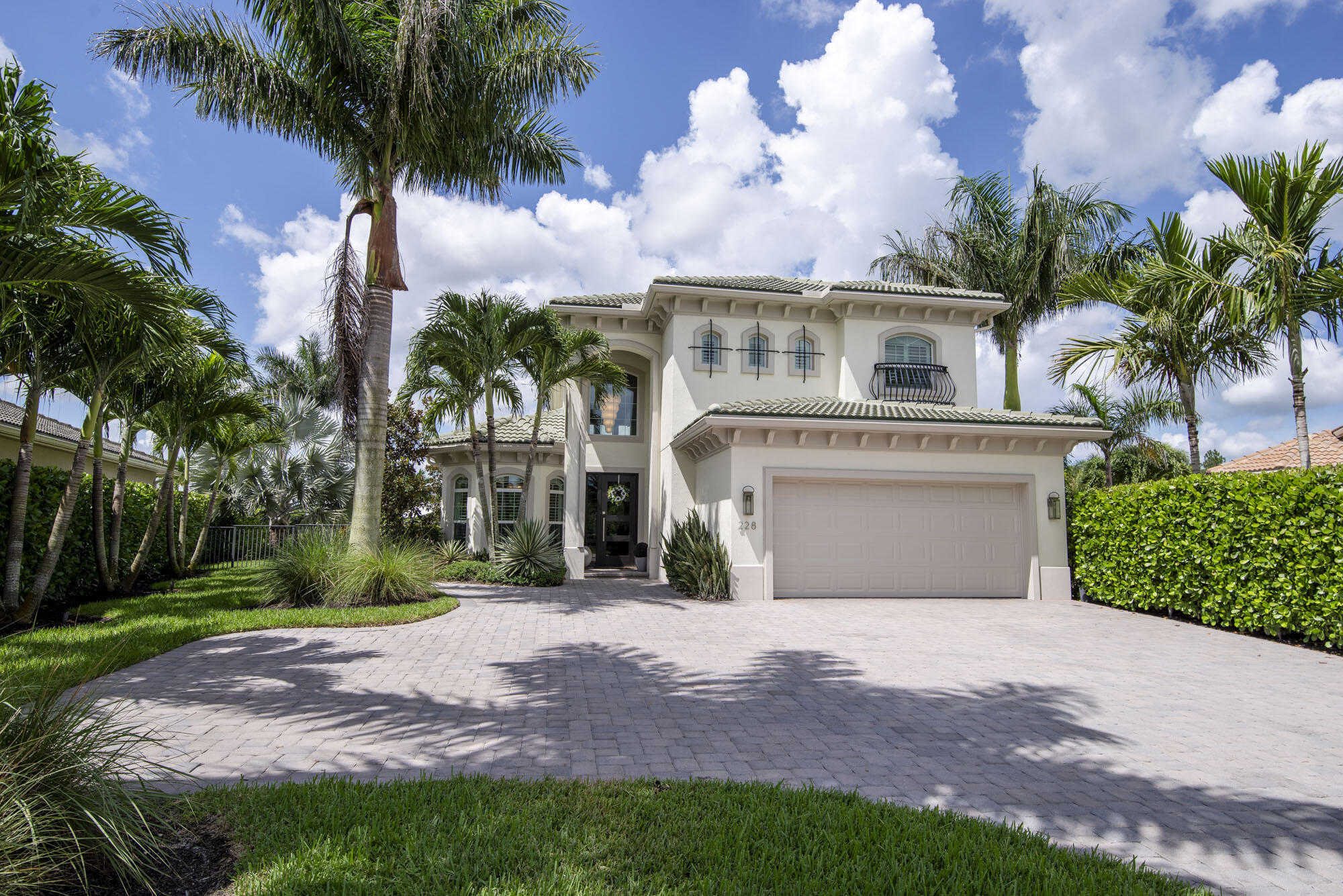 This exquisitely designed 2019-built home offers breathtaking lake, golf & preserve views from one of the best homesites in the resort style gated community of Jupiter Country Club. This rare Saviero model is one-of-a-kind and has 4 bedrooms, 4 baths plus a flex room/den. The prime cul-de-sac location within the community provides sweeping tree-lined views of Riverbend Park, the winding lake & the 11th green. Live comfortably in this energy efficient home with CBS construction, natural gas, reverse osmosis water filtration system in kitchen, and impact glass windows & doors throughout. The newly replaced custom impact glass front door and voluminous two story ceilings welcome you into the open concept great room with immediate backyard views through the wall to wall windows. Professionally designed & customized from top to bottom, this home exudes modern sophistication and provides all the essentials of easy Florida living. You will see the high quality finishes and attention to detail flow throughout the home. Stunning light fixtures are throughout the home. No standard finishes here! Rest peacefully in the primary retreat where the original floor plan was modified to encompass a downstairs guest room and transformed into the primary spa-like bath & expansive modern custom closet. Friends & family will gather at the kitchen's expansive center island featuring a waterfall quartz countertop & pendant lighting. Kitchen upgrades include gorgeous white solid wood cabinetry with glass panels, pull out shelving, tile backsplash, built-in refrigerator, 5 burner gas cooktop & double ovens. The flex room/office and a full bath are located downstairs. 3 guest bedrooms are upstairs-all bedrooms have walk-in closets with built-ins & 2 have ensuite baths. Step out through the great room's sliding glass doors into the outdoor oasis. Surrounded by mature palm trees and tropical landscaping, this area boasts a covered lanai, motorized retractable screens, a lovely pool & spa with a sunshelf and the most serene preserve, lake and golf course vistas. Sunsets are enchanting from this relaxing outdoor living space perfect for lounging & entertaining! This home can be purchased turnkey furnished including a golf cart. Jupiter Country Club is a luxury gated community conveniently located within close proximity of I-95 and the FL Turnpike, beaches, shopping, restaurants, parks & nature preserves. Club amenities & events offer a plethora of social opportunities and include a Greg Norman Signature golf course, 2 resort-style pools, the Sway restaurant & bar, a state-of-the-art fitness center + yoga/mat pilates/barre group fitness classes, massage/facial treatment services, tennis, bocce ball, pickle ball & basketball. Members enjoy reciprocal privileges to Invited Clubs worldwide. Live your best life here!