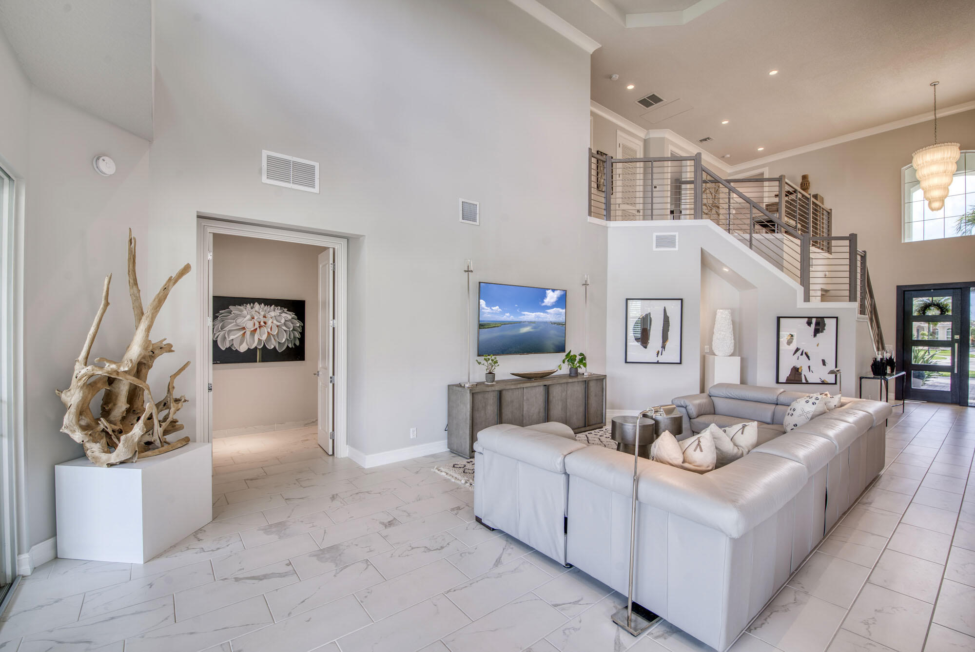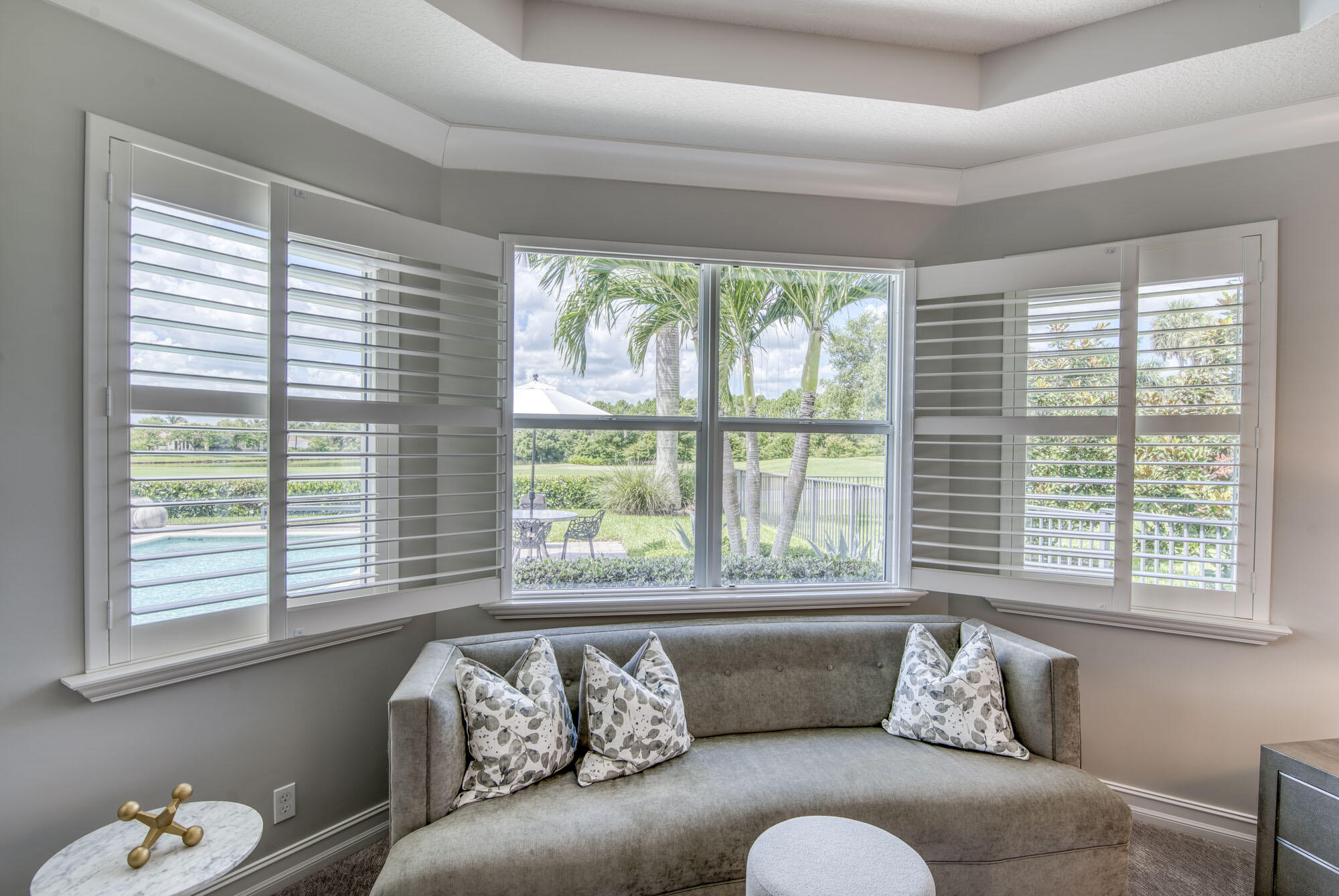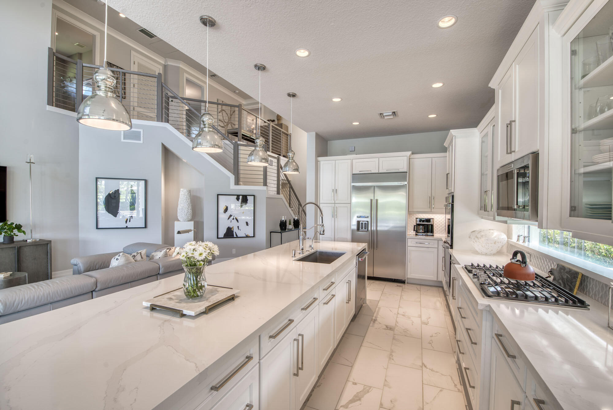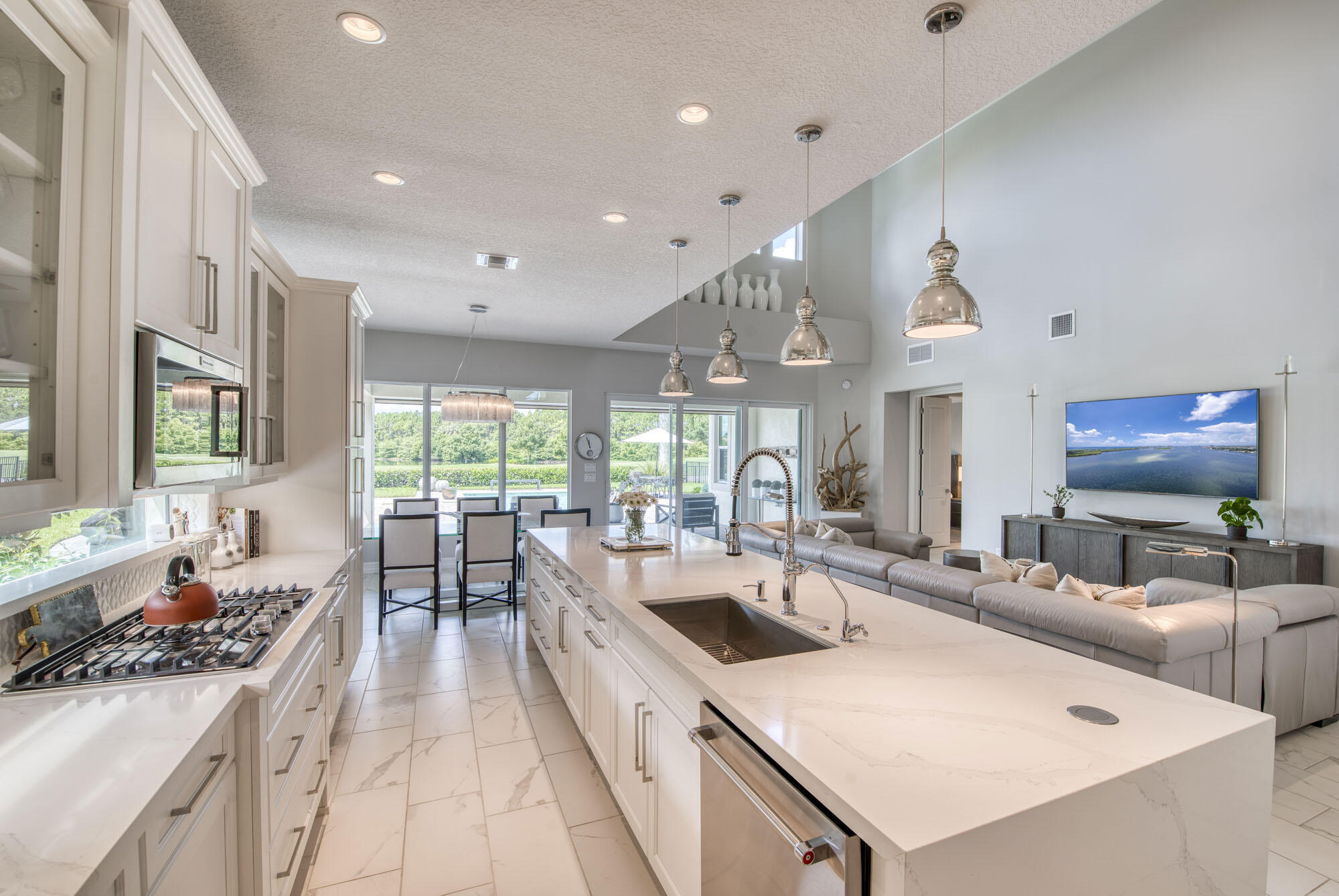 This exquisitely designed 2019-built home offers breathtaking lake, golf & preserve views from one of the best homesites in the resort style gated community of Jupiter Country Club. This rare Saviero model is one-of-a-kind and has 4 bedrooms, 4 baths plus a flex room/den. The prime cul-de-sac location within the community provides sweeping tree-lined views of Riverbend Park, the winding lake & the 11th green. Live comfortably in this energy efficient home with CBS construction, natural gas, reverse osmosis water filtration system in kitchen, and impact glass windows & doors throughout. The newly replaced custom impact glass front door and voluminous two story ceilings welcome you into the open concept great room with immediate backyard views through the wall to wall windows. Professionally designed & customized from top to bottom, this home exudes modern sophistication and provides all the essentials of easy Florida living. You will see the high quality finishes and attention to detail flow throughout the home. Stunning light fixtures are throughout the home. No standard finishes here! Rest peacefully in the primary retreat where the original floor plan was modified to encompass a downstairs guest room and transformed into the primary spa-like bath & expansive modern custom closet. Friends & family will gather at the kitchen's expansive center island featuring a waterfall quartz countertop & pendant lighting. Kitchen upgrades include gorgeous white solid wood cabinetry with glass panels, pull out shelving, tile backsplash, built-in refrigerator, 5 burner gas cooktop & double ovens. The flex room/office and a full bath are located downstairs. 3 guest bedrooms are upstairs-all bedrooms have walk-in closets with built-ins & 2 have ensuite baths. Step out through the great room's sliding glass doors into the outdoor oasis. Surrounded by mature palm trees and tropical landscaping, this area boasts a covered lanai, motorized retractable screens, a lovely pool & spa with a sunshelf and the most serene preserve, lake and golf course vistas. Sunsets are enchanting from this relaxing outdoor living space perfect for lounging & entertaining! This home can be purchased turnkey furnished including a golf cart. Jupiter Country Club is a luxury gated community conveniently located within close proximity of I-95 and the FL Turnpike, beaches, shopping, restaurants, parks & nature preserves. Club amenities & events offer a plethora of social opportunities and include a Greg Norman Signature golf course, 2 resort-style pools, the Sway restaurant & bar, a state-of-the-art fitness center + yoga/mat pilates/barre group fitness classes, massage/facial treatment services, tennis, bocce ball, pickle ball & basketball. Members enjoy reciprocal privileges to Invited Clubs worldwide. Live your best life here!