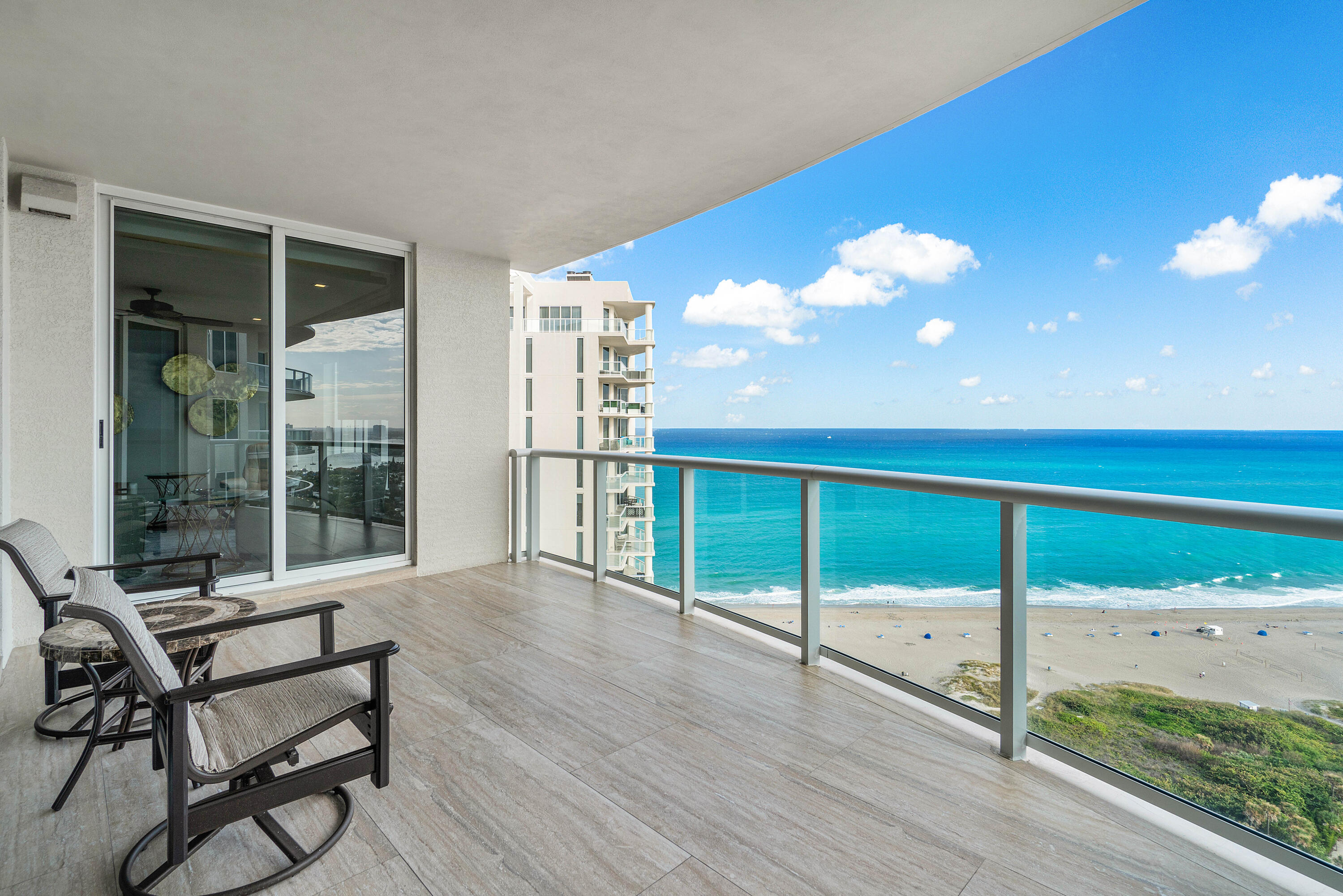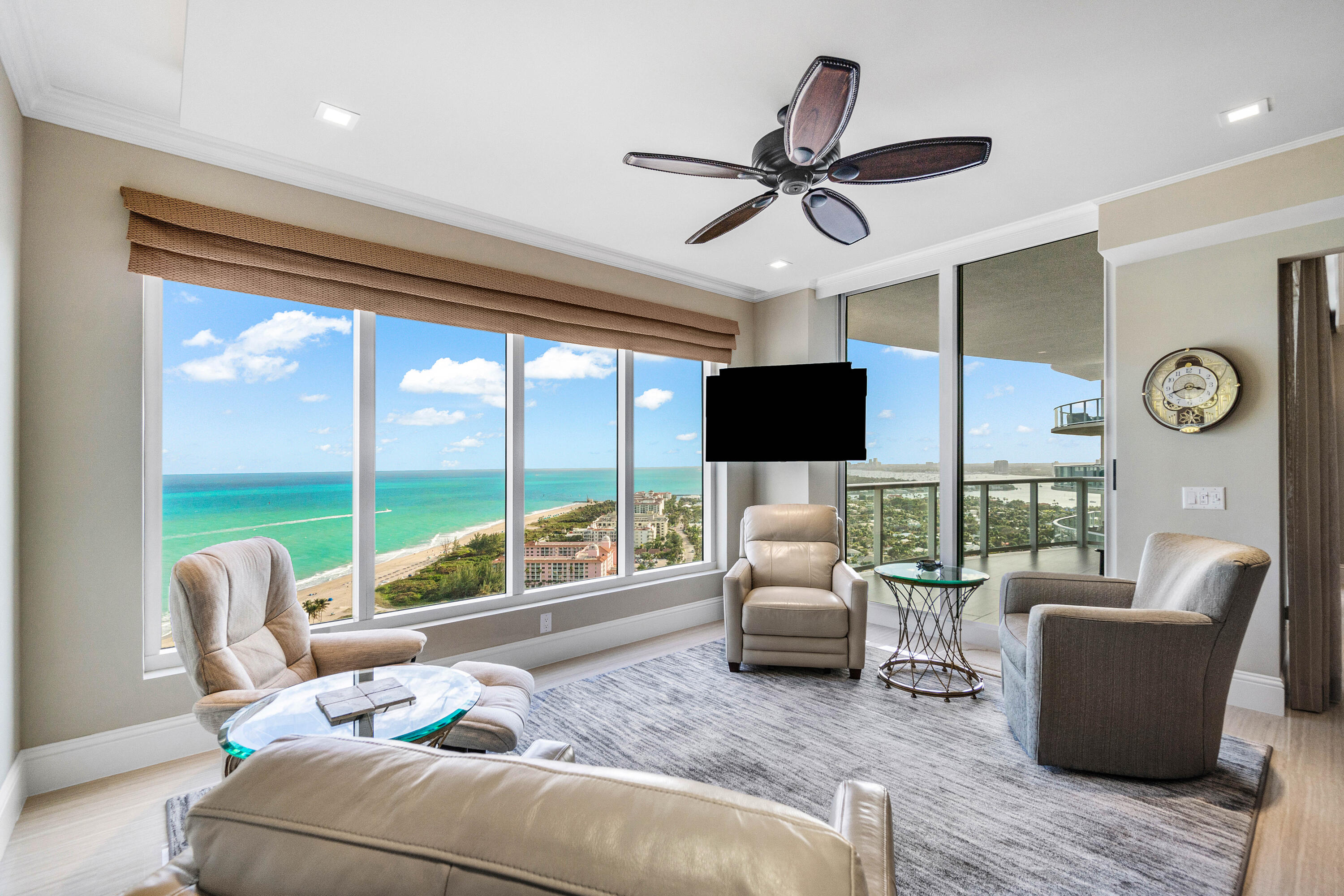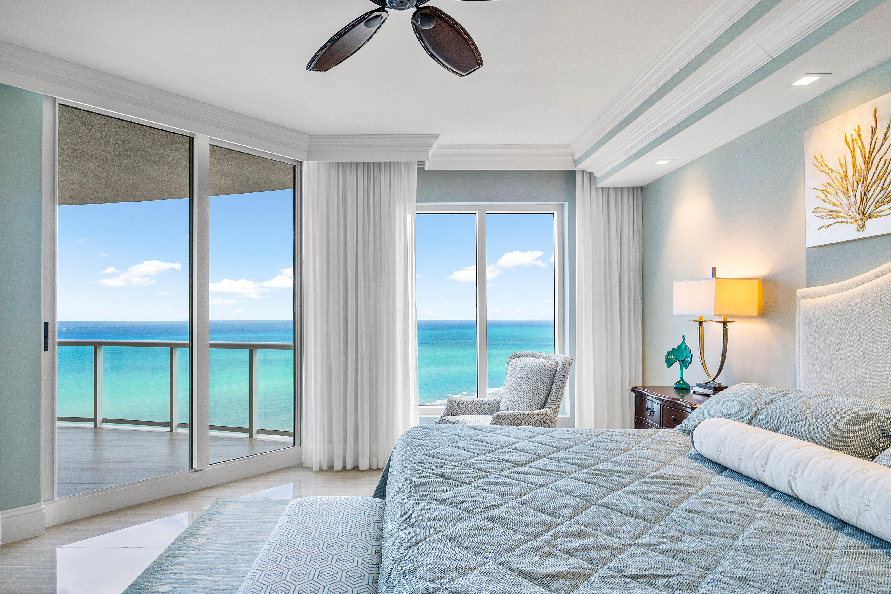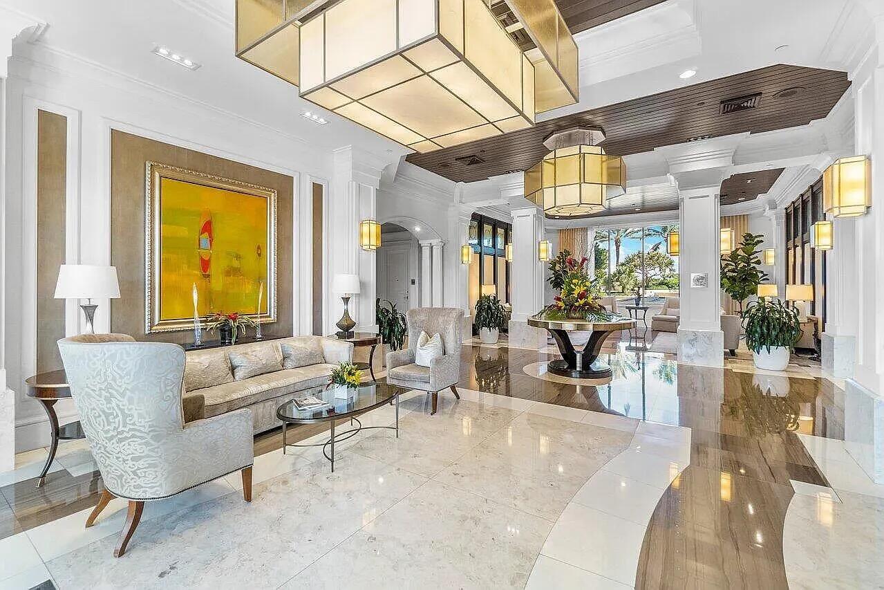 Professionally reimagined by interiors icon Steven G, the three-bedroom, three-and-a-half-bath residence spans a flow-through layout with private elevator entry, delivering sweeping Atlantic to Intracoastal views and a sense of arrival that is both intimate and iconic.