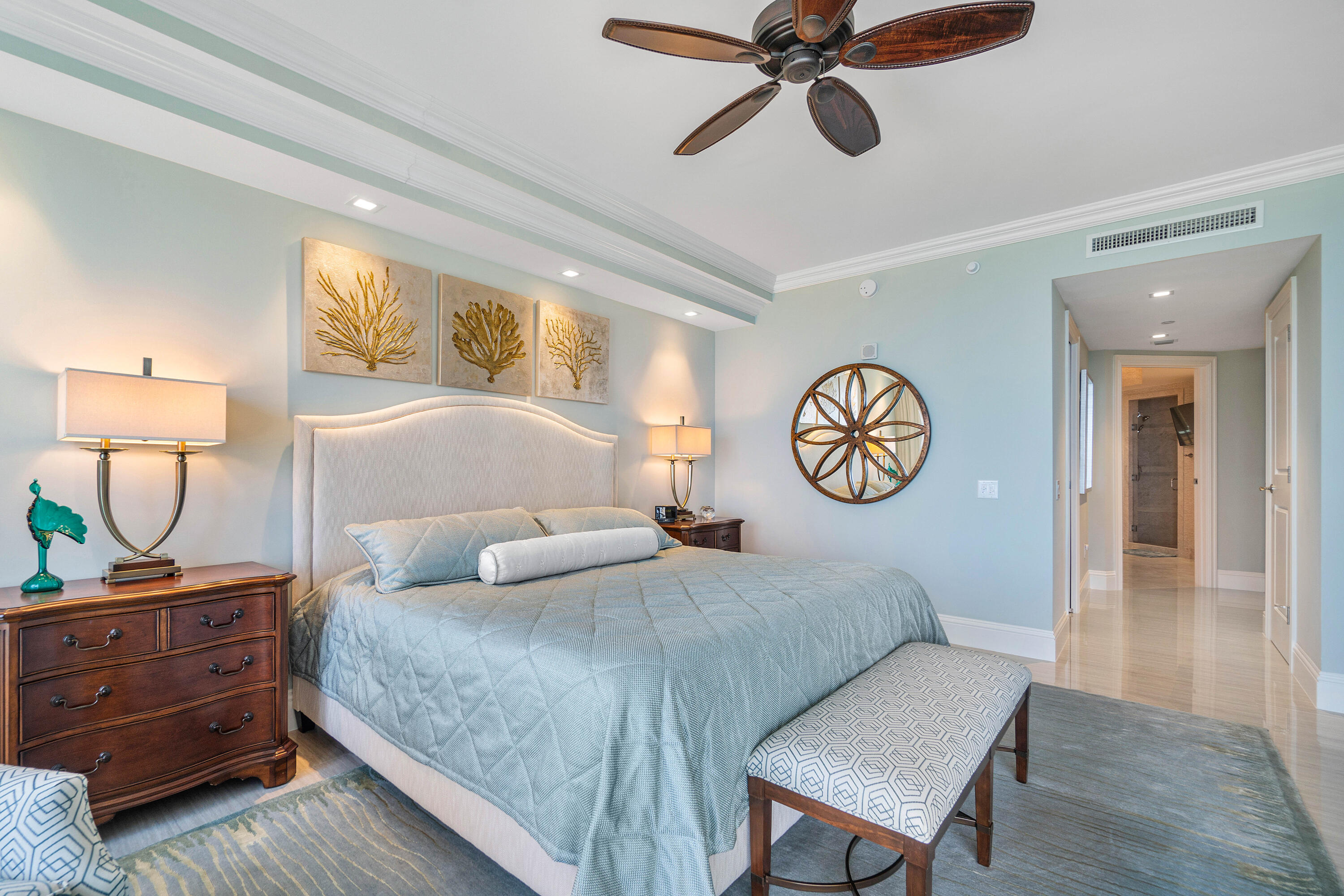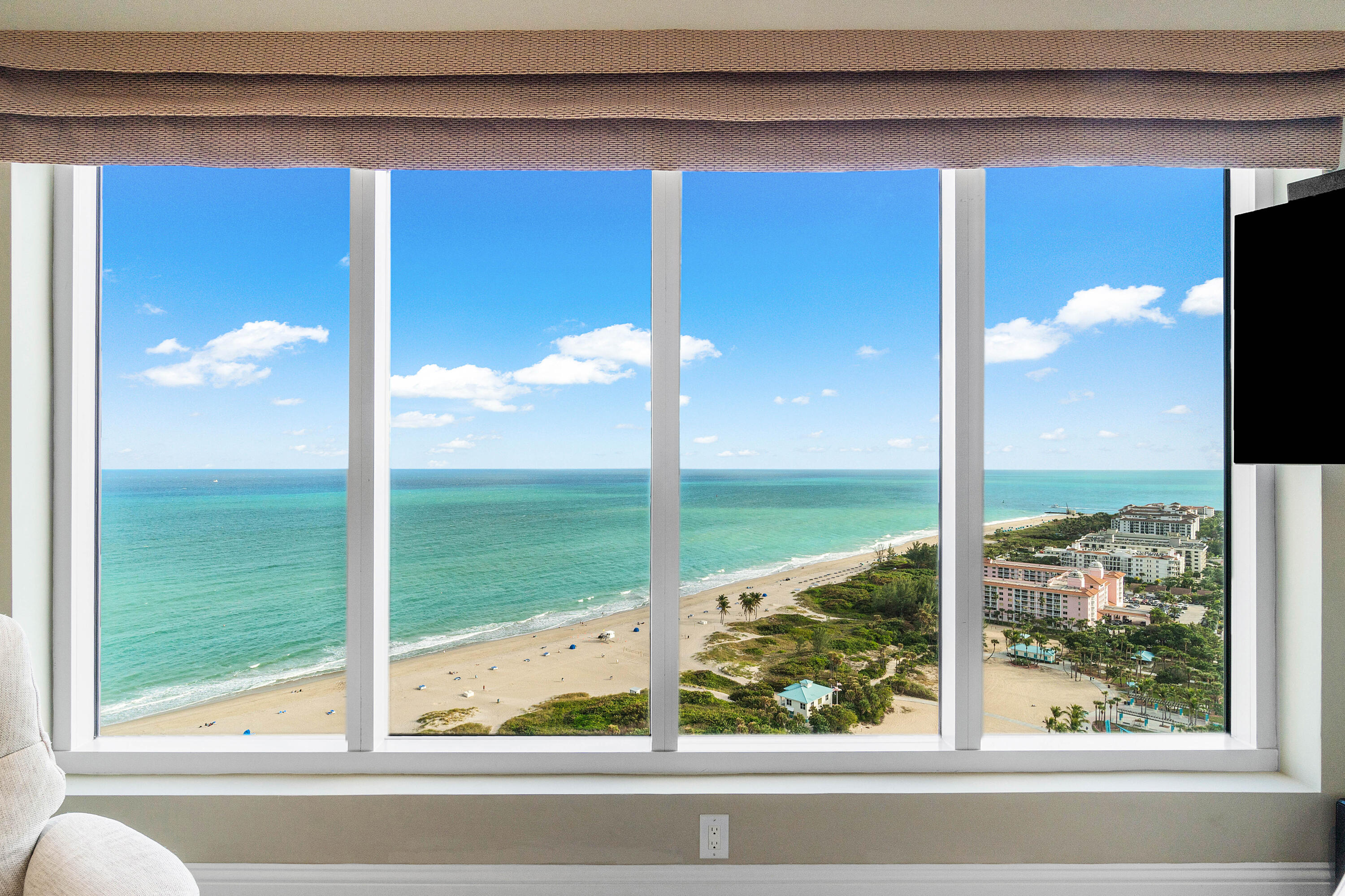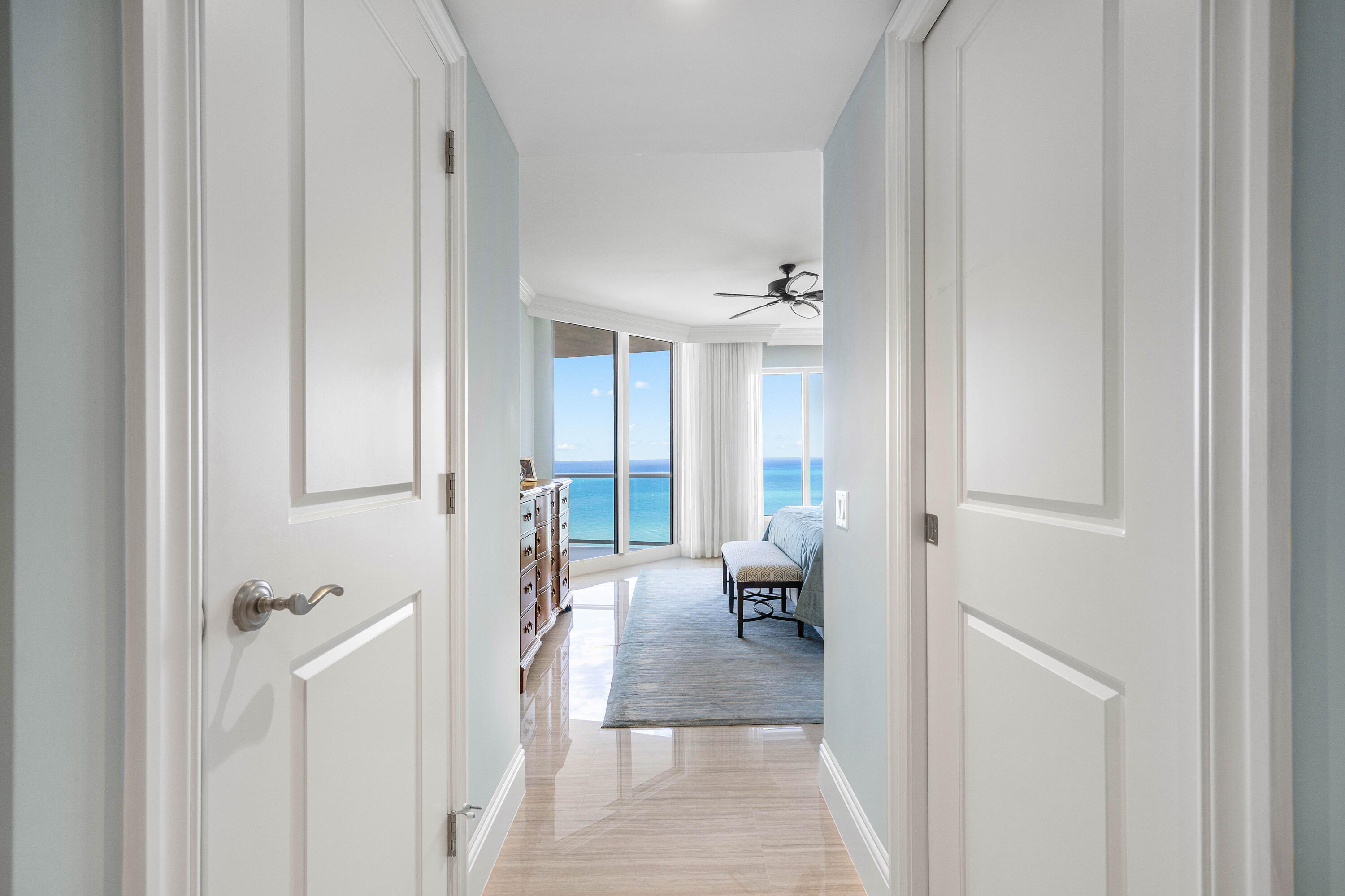 Professionally reimagined by interiors icon Steven G, the three-bedroom, three-and-a-half-bath residence spans a flow-through layout with private elevator entry, delivering sweeping Atlantic to Intracoastal views and a sense of arrival that is both intimate and iconic.